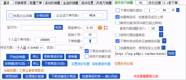 首先右边登录商家后台,登录要改销量的链接所在的店铺。如果之前登录过,不需要再重新登录。 企业店这里,如果不是企业店不要勾选,是企业店才勾上。企业店下单件数9524,这个是固定的,不要修改,意思就是我们一单。最多拍9524件。 宝贝ID这里。从拼多多后台商品列表复制过来。 预设方案,如果是个人店可以选择20万的方案,也可以选择9524的方案,如果是企业店,这里就不需要调整了。 下单件数重点来说一下。因为拼多多的销量是购买件数,而不是订单数量,比如说我选择了20万的方案,意思就是一个订单会拍20万件,也就是20万销量,那么如果我想改100万销量,这里只需要填5就可以了。那么如果我想改200万销量,那就填10。 好了,上面就是冠军助手改百万销量的整体设置了。 点击开始改销量。下面就是冠军助手自动执行的时间了,大概需要2分钟,我们留意右下角的提示。正常的话,就会提示下单成功,如果遇到问题请联系客服处理。 再回到软件首页。进行操作付款。 然后还有最后一步,我们来到百万销量界面,点击处理炮灰。这个炮灰就是我们软件自动发布的,只是用来改销量的一个链接,一定记得处理掉,不然的话会被薅羊毛。 以上就是冠军助手改百万销量的整体流程,操作完成后,我们可以到自己的链接里边看一下效果。 |